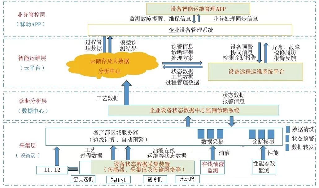 因此運用人工智能和信息網(wǎng)絡等現(xiàn)代技術(shù)逐漸轉(zhuǎn)型升級,推動水泥工業(yè)生產(chǎn)、管理和營銷模式的變革,已成為我國水泥工業(yè)高質(zhì)量發(fā)展的重要任務。智能制造代表著未來先進制造業(yè)的發(fā)展方向,在智能制造環(huán)境下,現(xiàn)有技術(shù)裝備的運行維護管理將受到空前的挑戰(zhàn)。對水泥企業(yè)動設備安全狀態(tài)把握,設備維修、設備運維的調(diào)整和發(fā)展方向,是目前水泥設備維修系統(tǒng)研究和規(guī)劃的重大課題。而基于油液監(jiān)測的動設備在線潤滑監(jiān)控與遠程智能運維云平臺建設,正是現(xiàn)代水泥企業(yè)智能制造的重要工作之一。